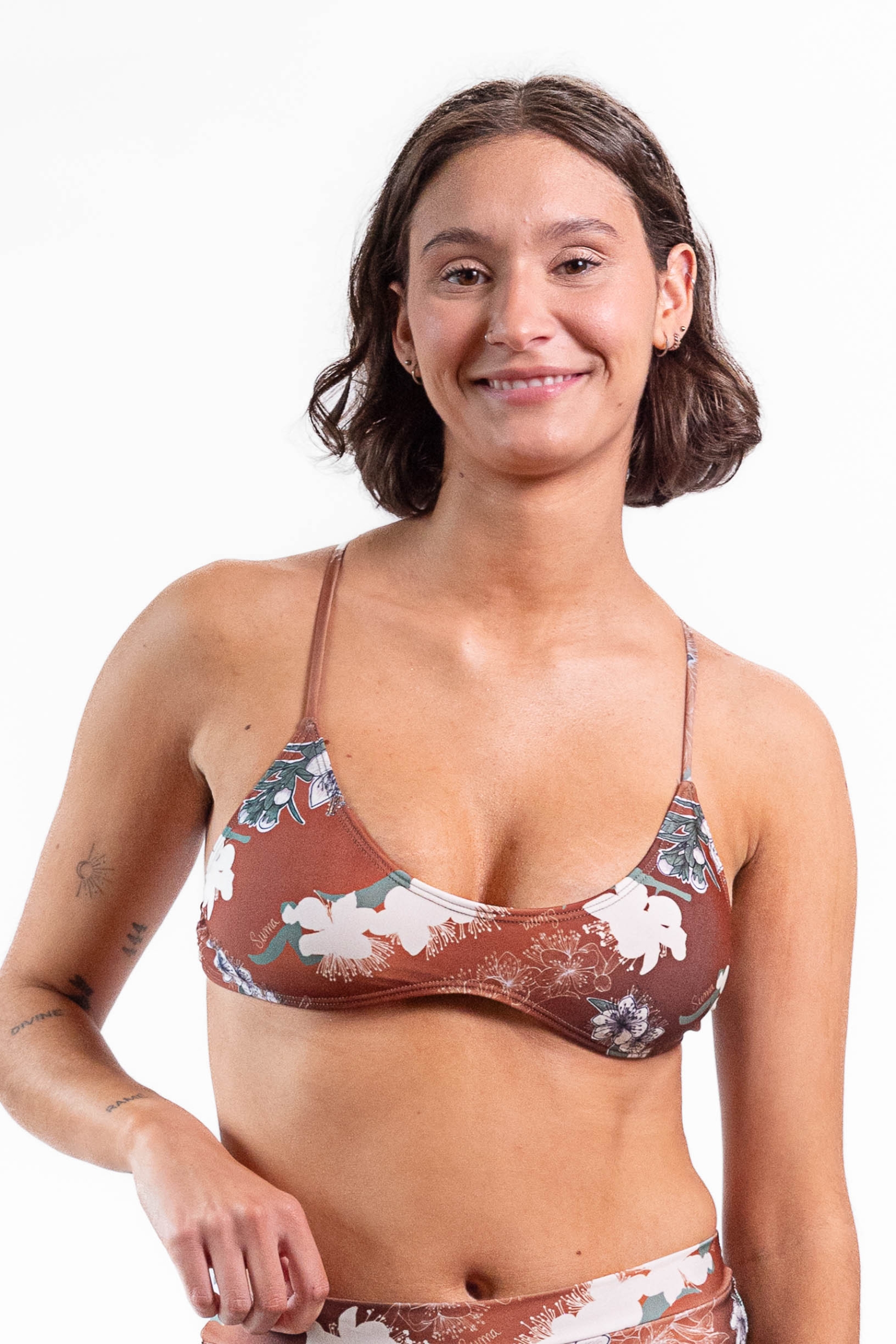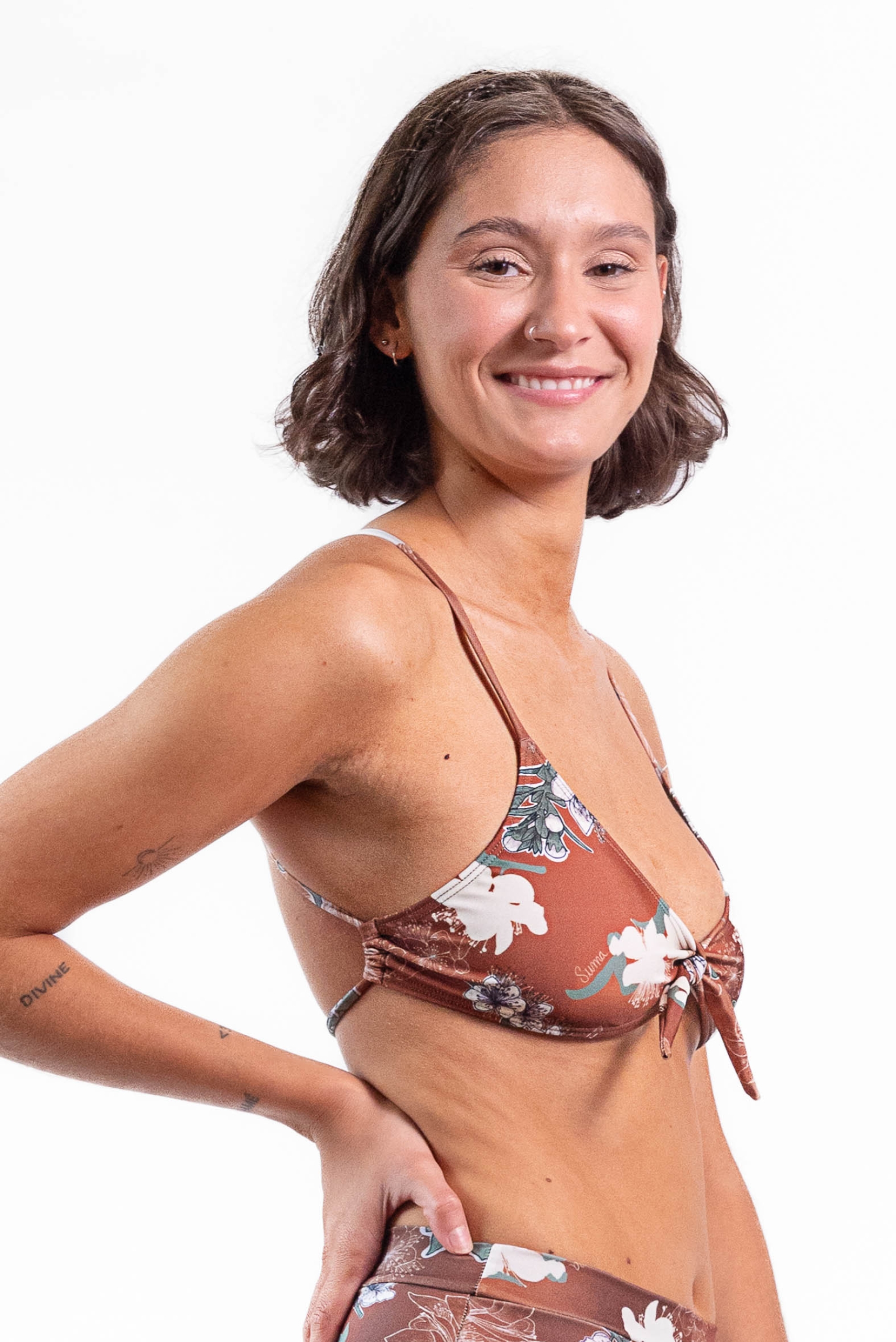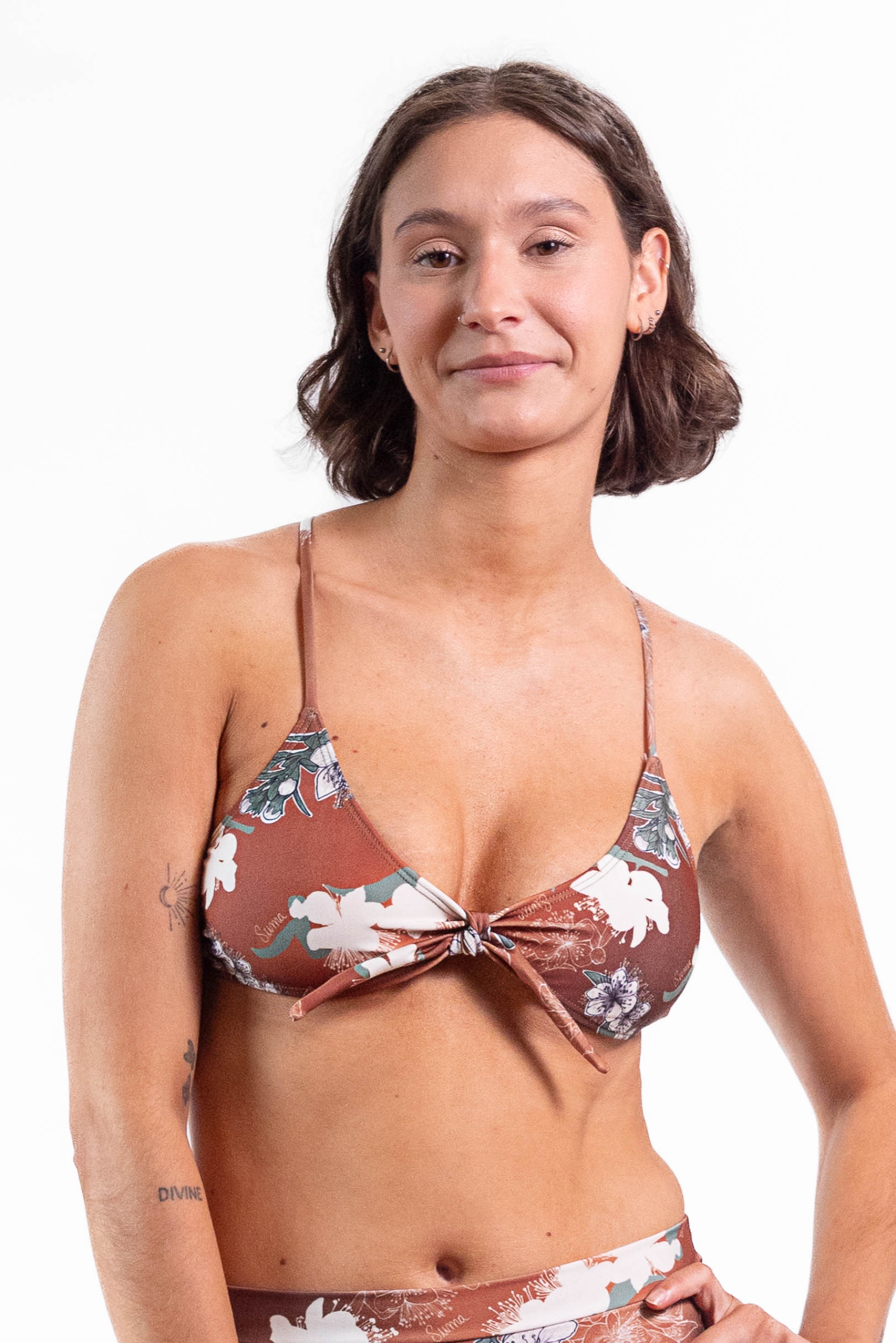 Corpiño con escote V en delantera, y espalda completamente descubierta. Tiene una jareta en los laterales, donde pasar las tiras, para que puedas regularlo a tu gusto. Está forrado, con una abertura a cada lado, para colocar tazas en caso de que así lo prefieras. Confeccionado con un tricot de excelente calidad, que ayuda a que las estampas y colores perduren con el uso, sin sufrir cambios. Trae un lazo para atar en la parte del busto y que quede mas escotado.
