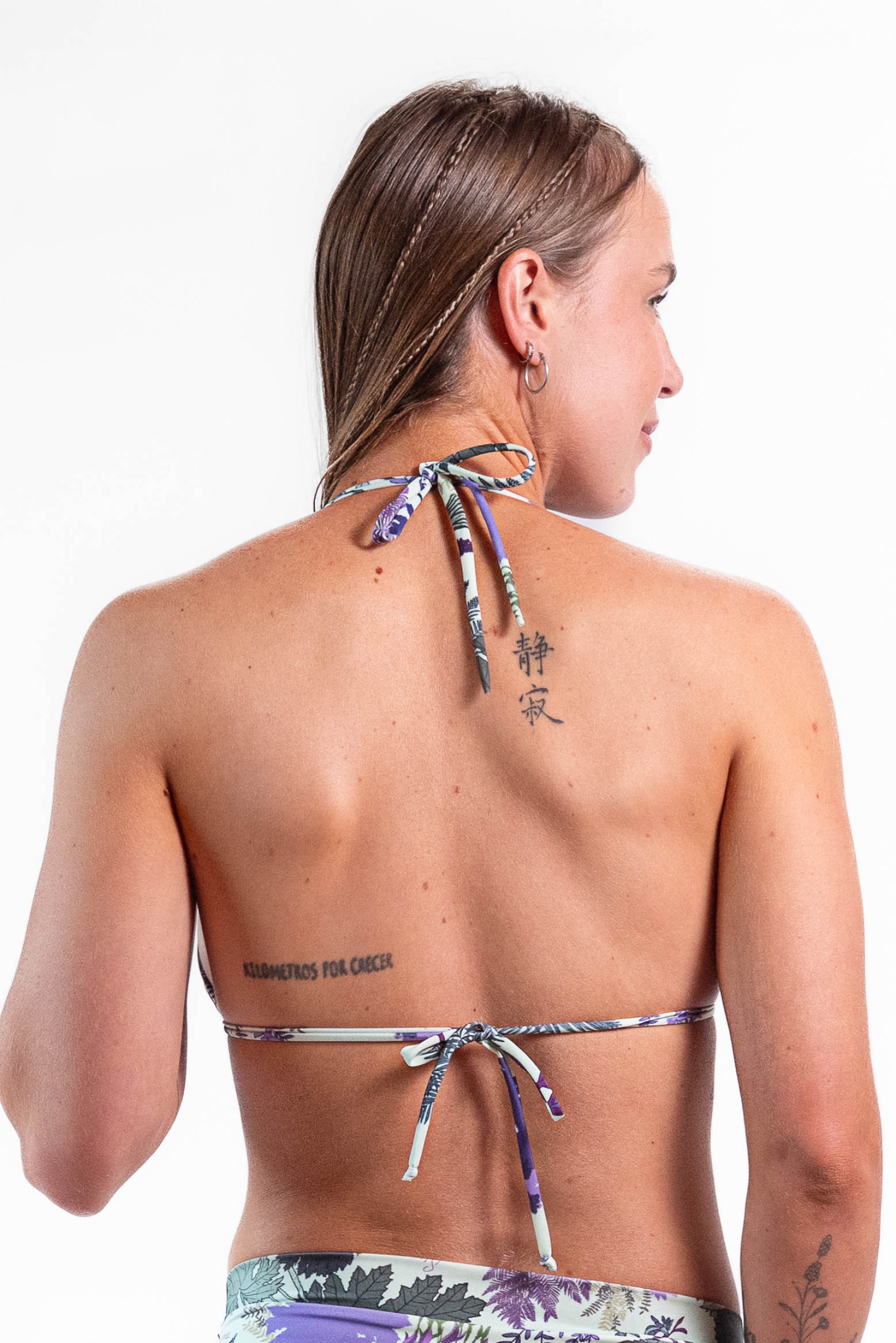 Clásico triangulito, con tiras para atar, tanto en el cuello como en la espalda, lo que permite que puedas regularlo como más te guste. Está forrado, con una abertura a cada lado, para colocar tazas en caso de que así lo prefieras. Confeccionado con un tricot de excelente calidad, que ayuda a que las estampas y colores perduren con el uso, sin sufrir cambios.