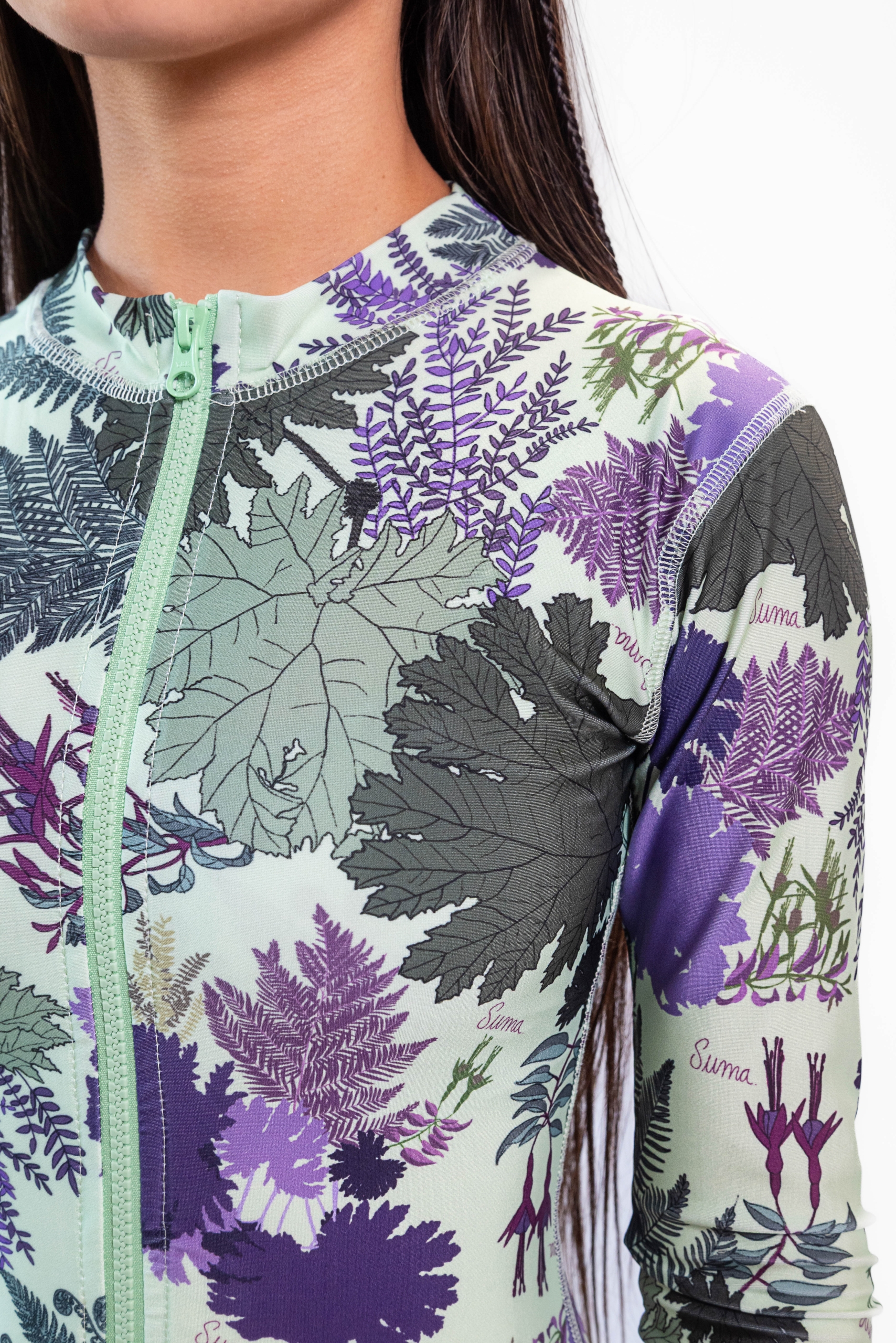 Malla enteriza, con mangas largas, escote cerrado y cierre frontal. Terminaciones y detalles con bordador. Con todo el delantero forrado. Pensada para las actividades y deportes acuaticos. Confeccionada con un tricot de excelente calidad, que ayuda a que las estampas y colores perduren con el uso, sin sufrir cambios.