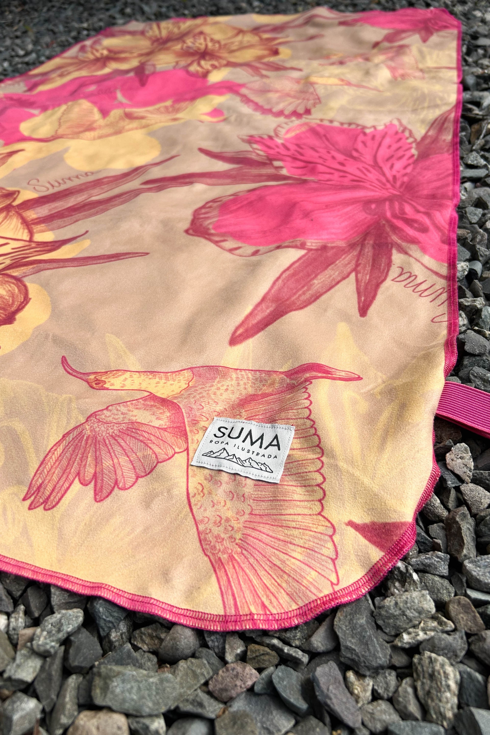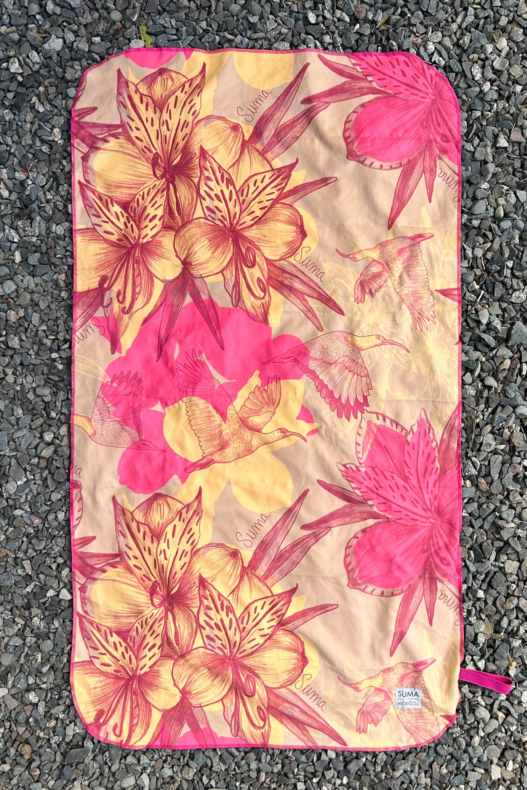Tolla de microfibra grande, de secado rápido y super practica para llevar a todos lados! ideal para viajes y llevar en tu mochila. Medidas del toallon 74x129cm, las medidas pueden variar unos cm y el color del hilo y elástico también. Esta estampa es de un lado Rosa y del otro amarillo como figura en la foto.