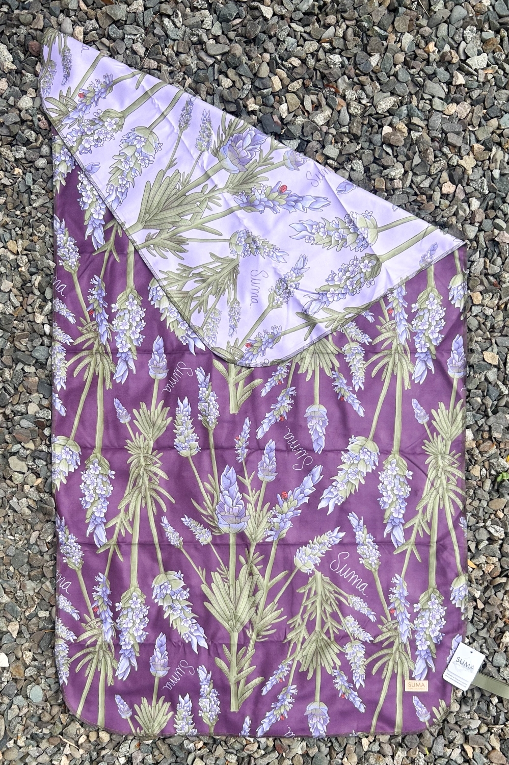 Tolla de microfibra grande, de secado rápido y super practica para llevar a todos lados! ideal para viajes y llevar en tu mochila. Medidas del toallon 74x129cm, las medidas pueden variar unos cm y el color del hilo y elástico también. Esta estampa es de un lado Violeta y del otro Lila como figura en la foto.